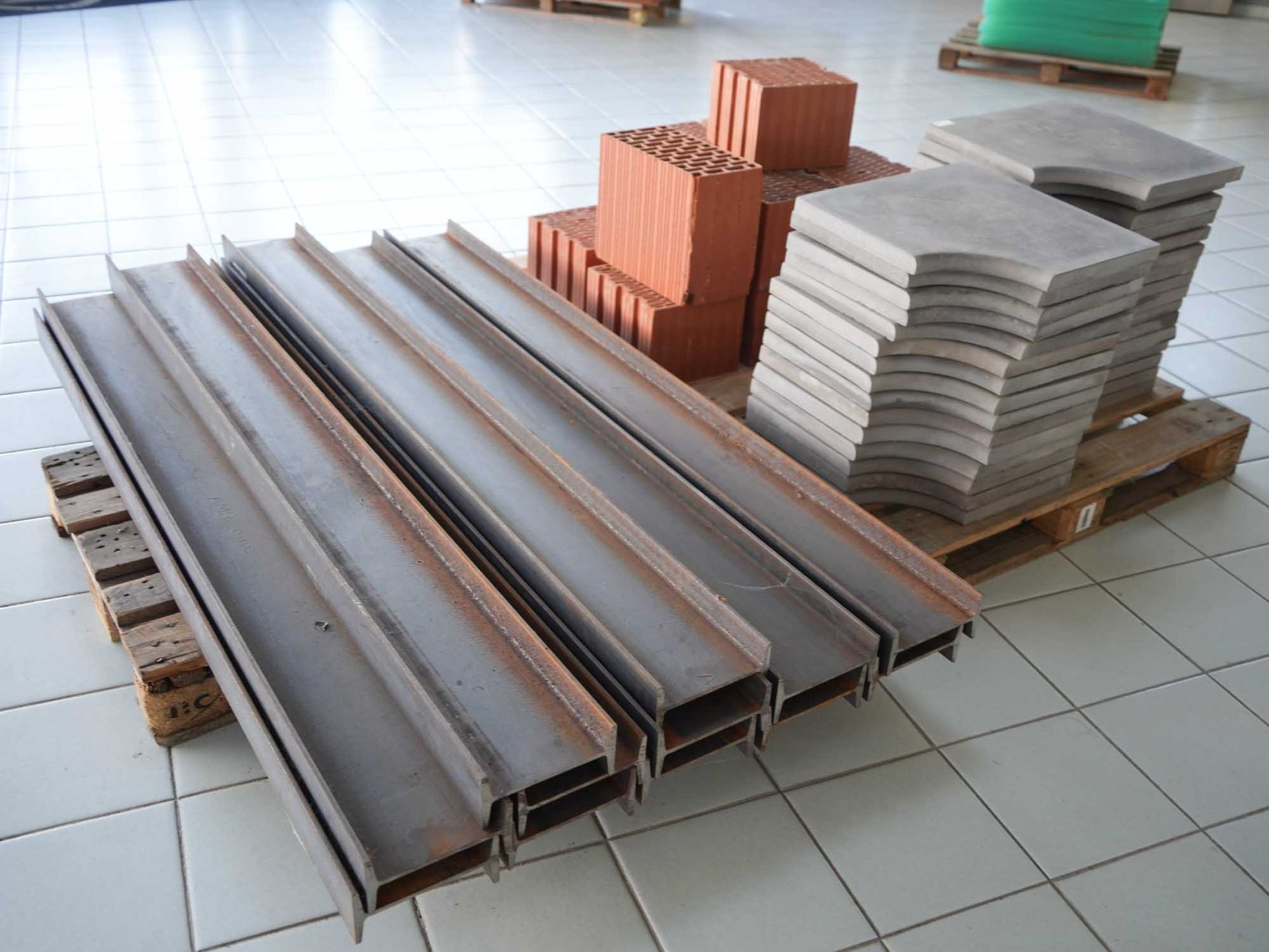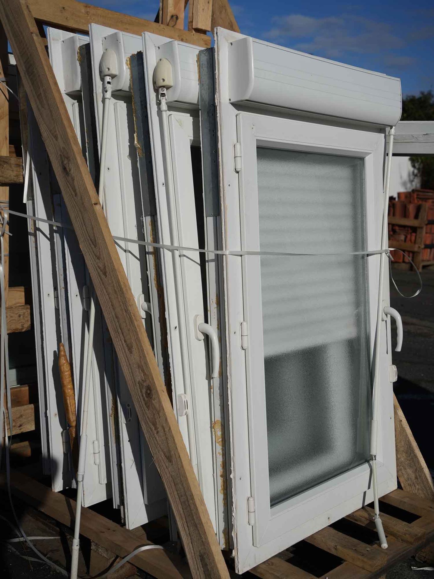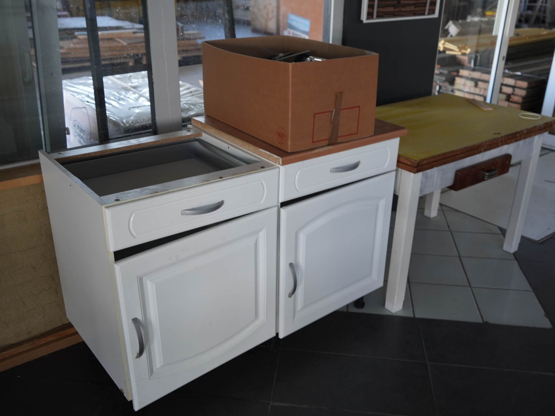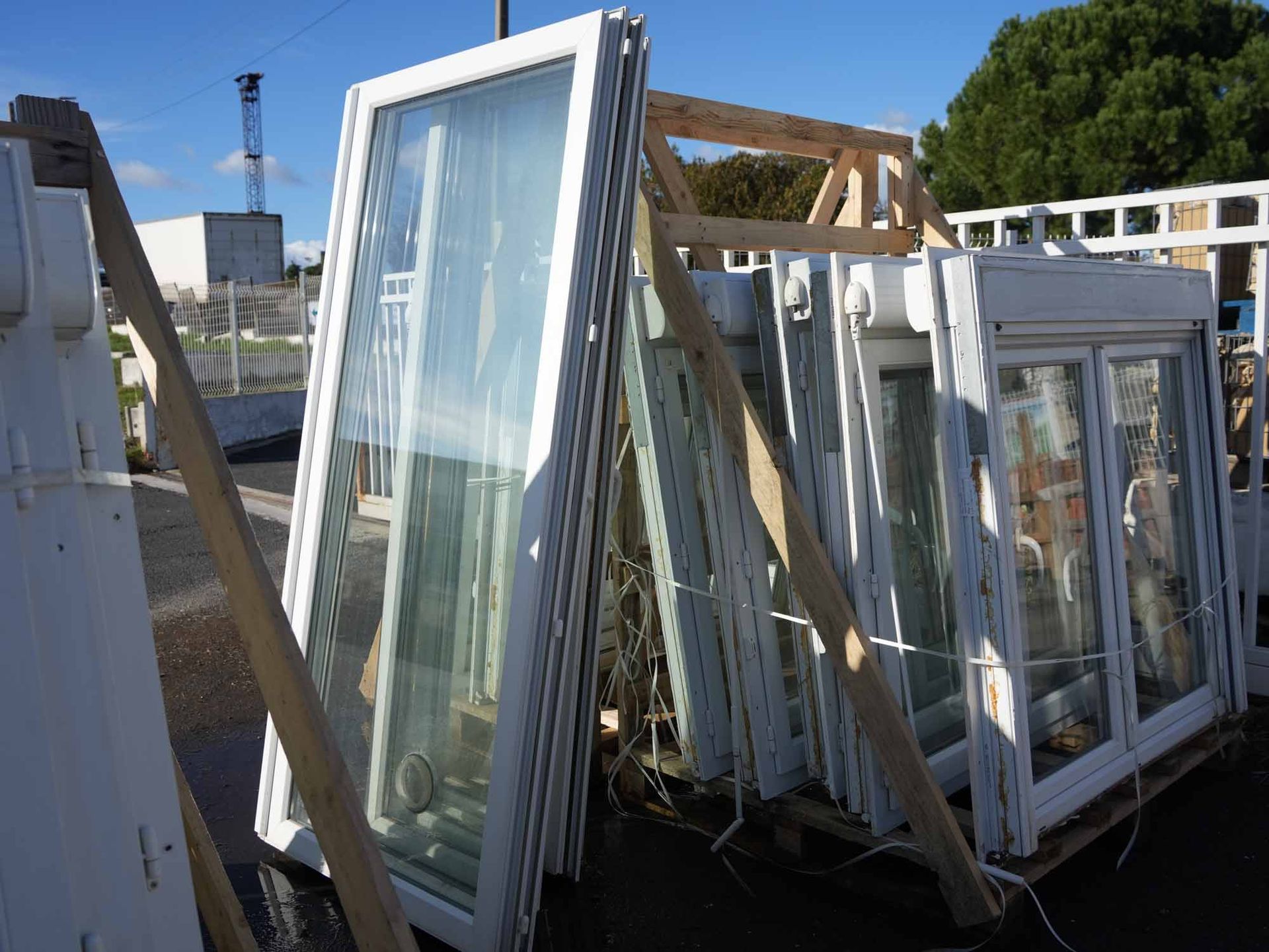 nombreuses menuiseries PVC, très grand lot de plots de terrasse (plusieurs dimensions), palettes de tuiles, plaques de mélaminé, isolants PU, plateaux avec vasques d’angle, grand lot de rouleaux de moquette (nombreuses couleurs), modules de cuisine, banque d’accueil, etc.