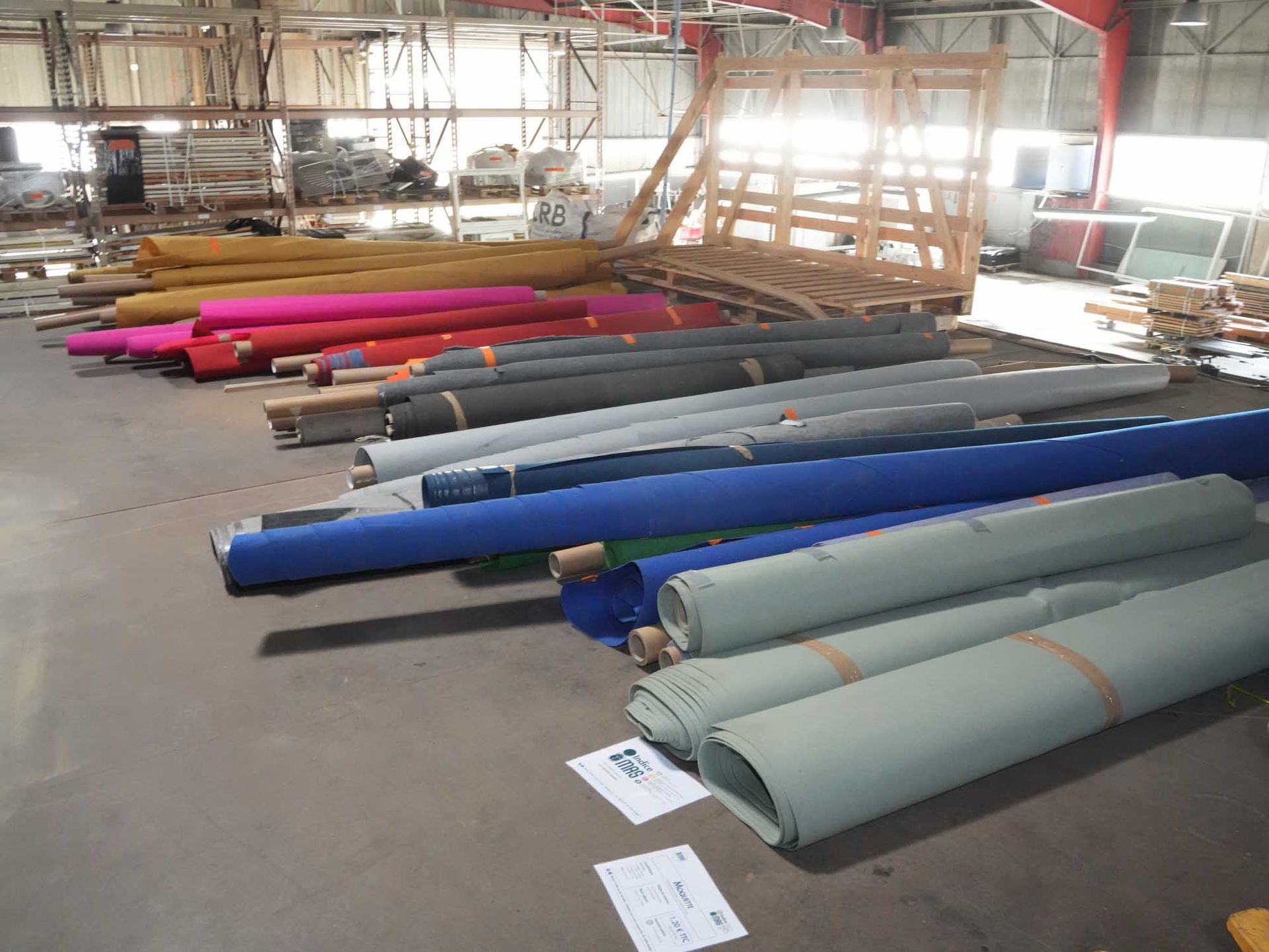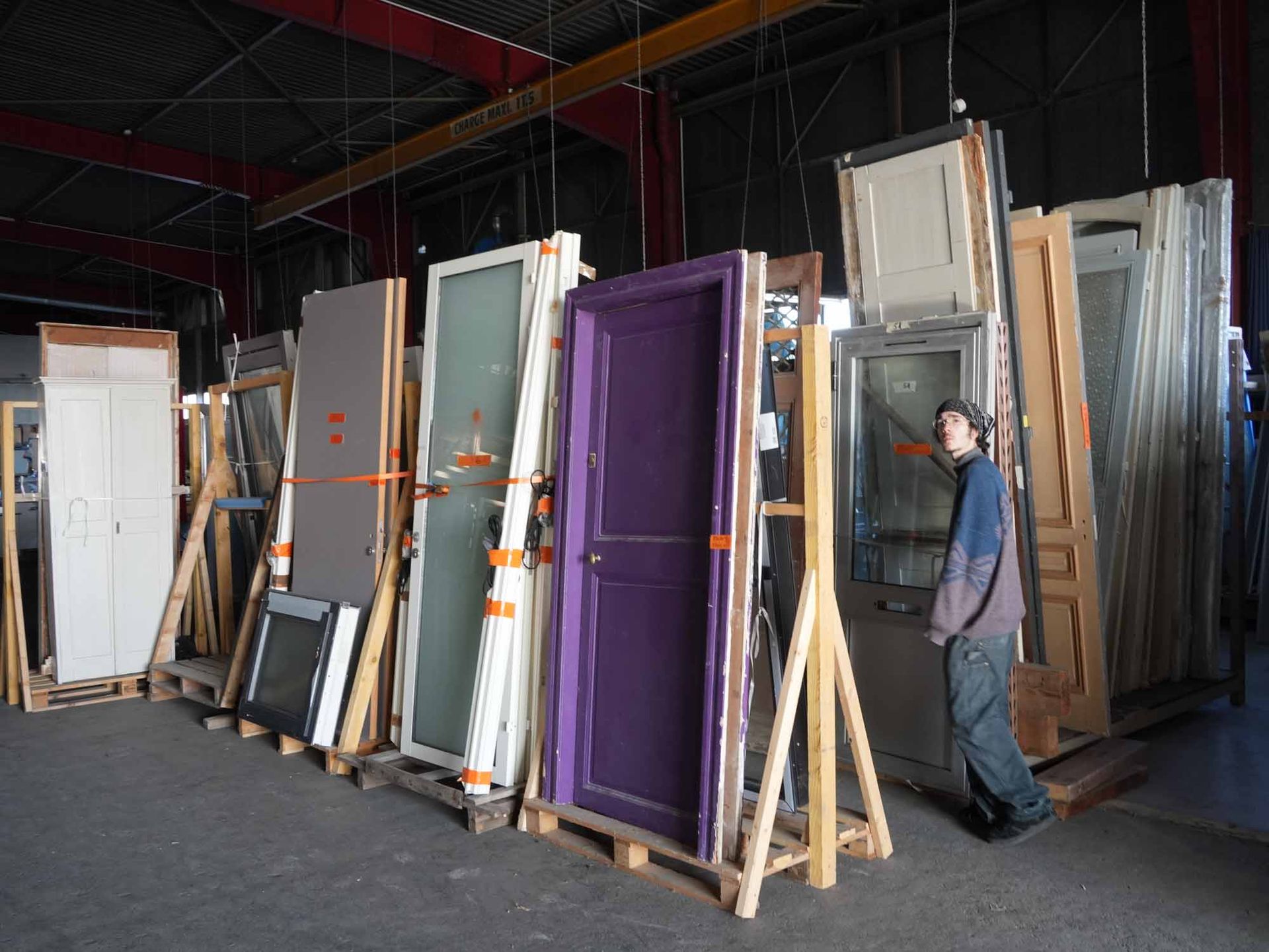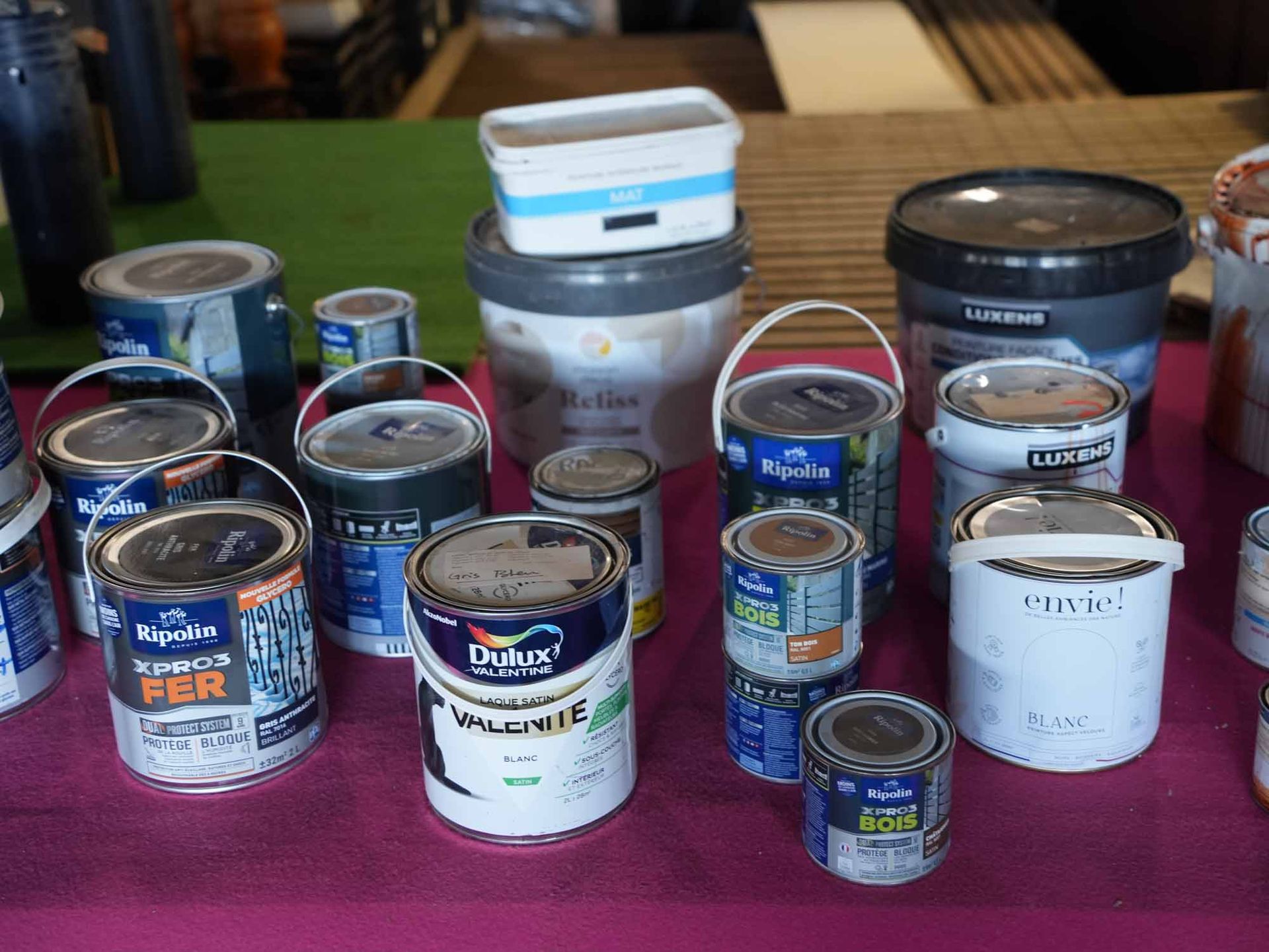 nombreuses menuiseries PVC, très grand lot de plots de terrasse (plusieurs dimensions), palettes de tuiles, plaques de mélaminé, isolants PU, plateaux avec vasques d’angle, grand lot de rouleaux de moquette (nombreuses couleurs), modules de cuisine, banque d’accueil, etc.