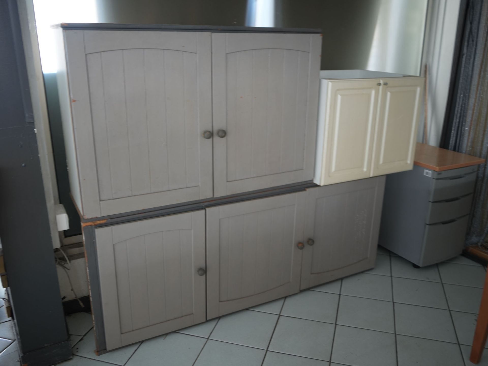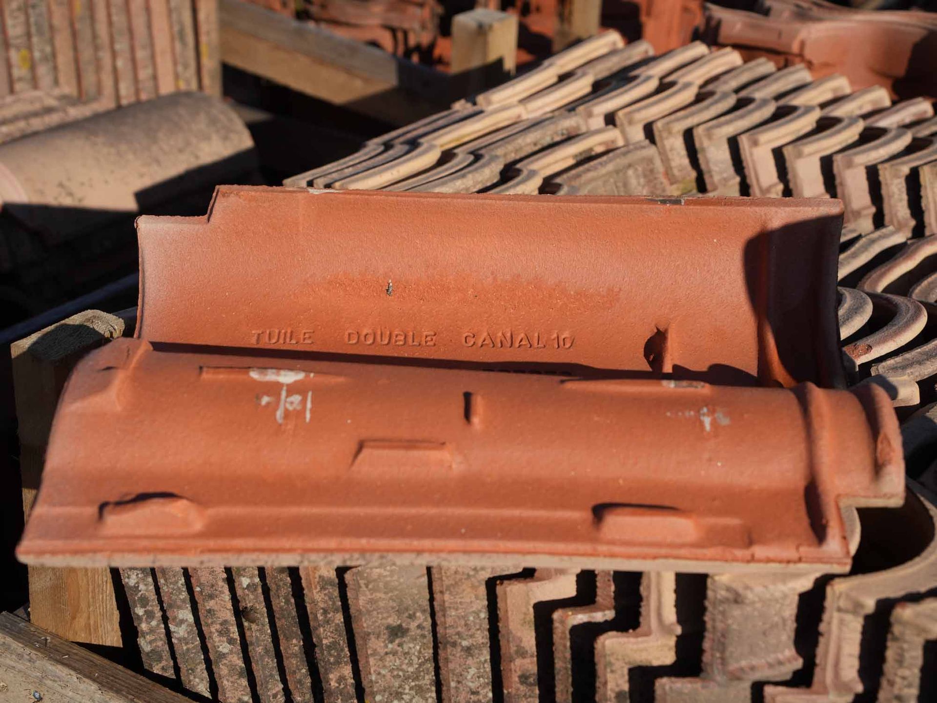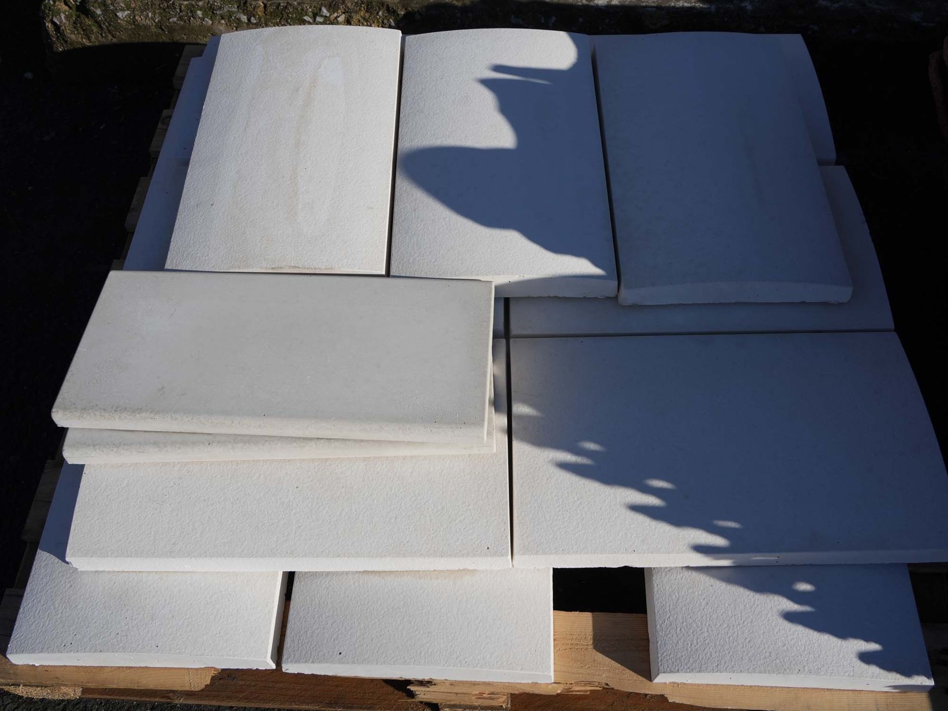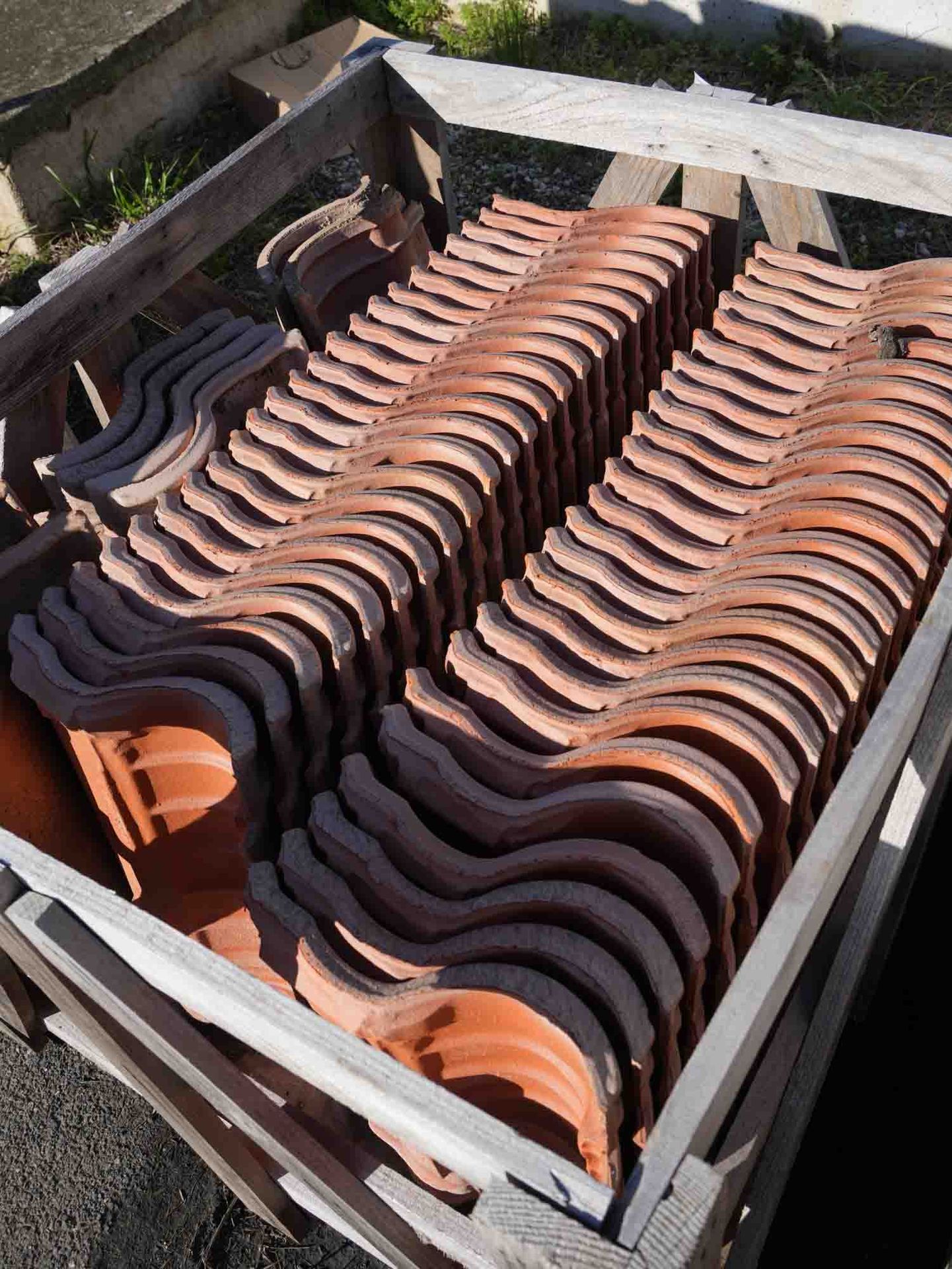 nombreuses menuiseries PVC, très grand lot de plots de terrasse (plusieurs dimensions), palettes de tuiles, plaques de mélaminé, isolants PU, plateaux avec vasques d’angle, grand lot de rouleaux de moquette (nombreuses couleurs), modules de cuisine, banque d’accueil, etc.