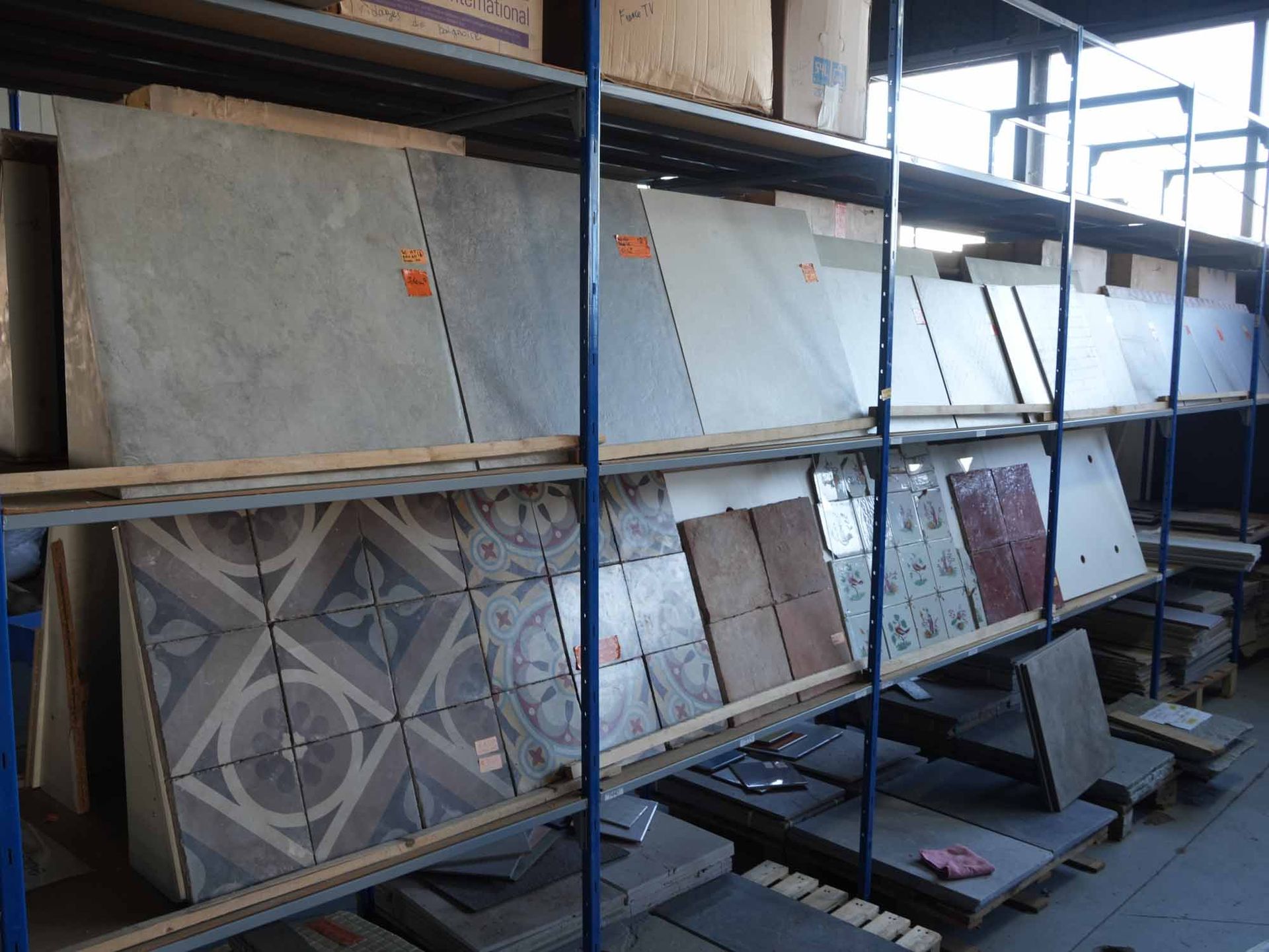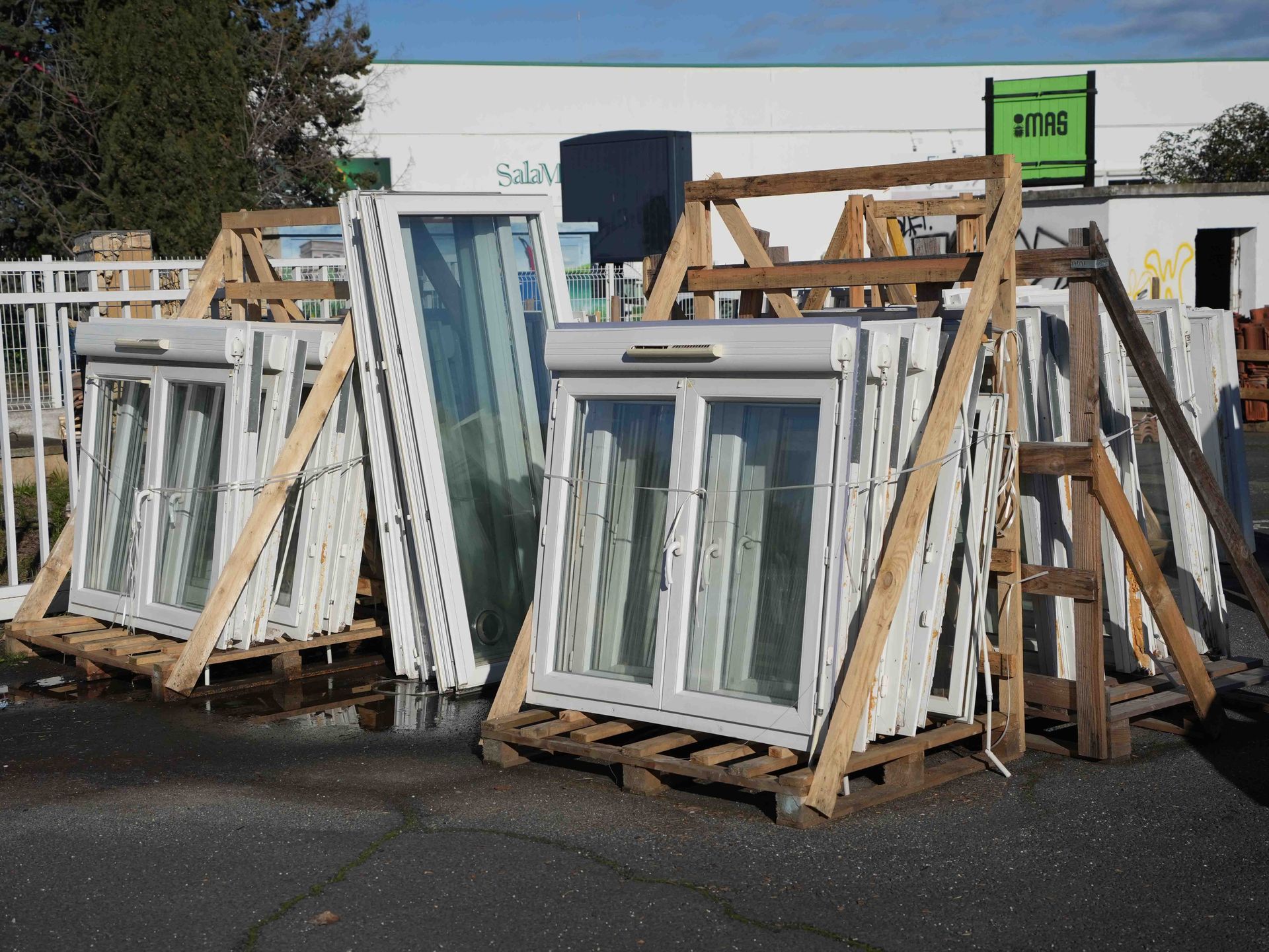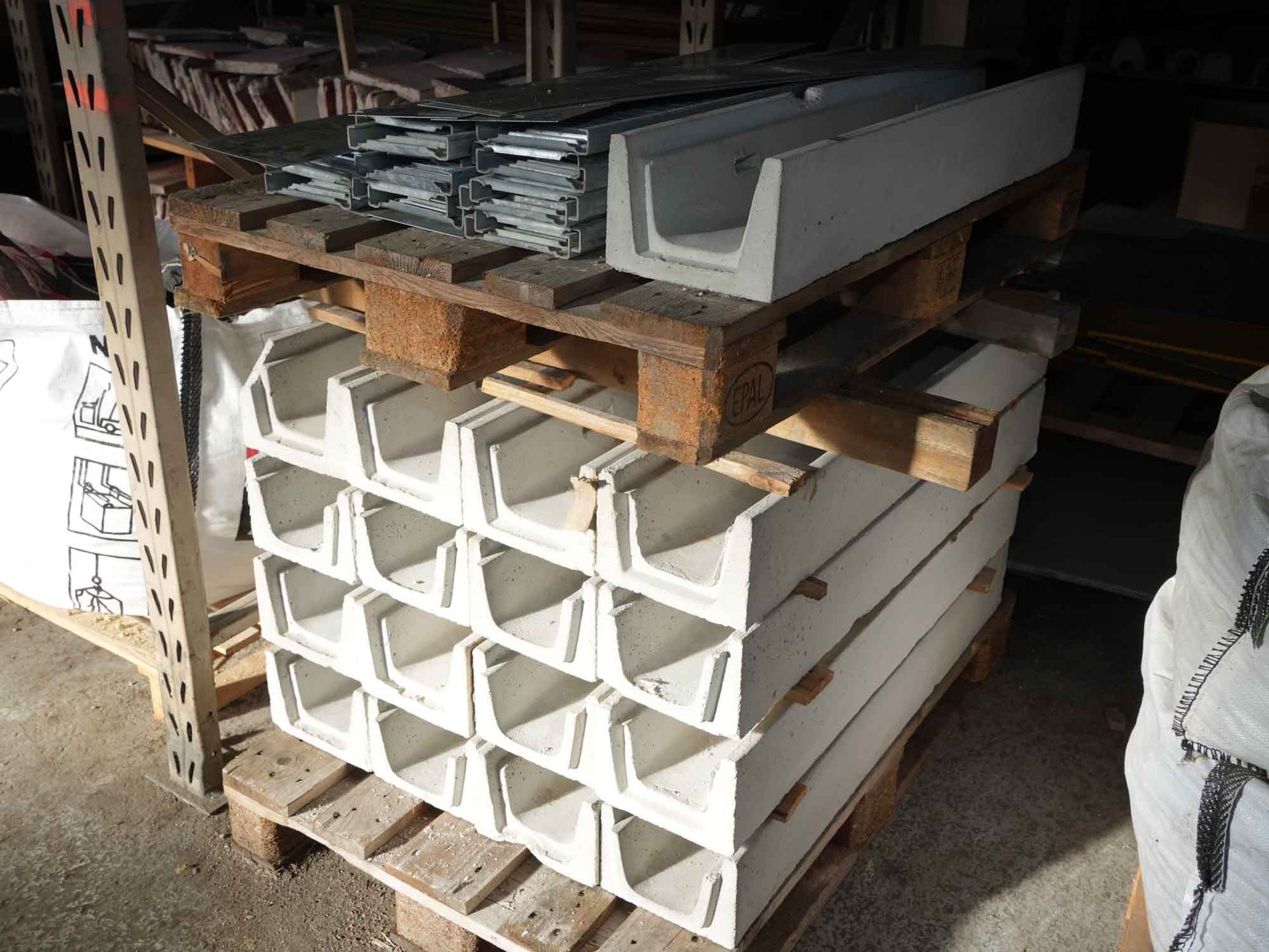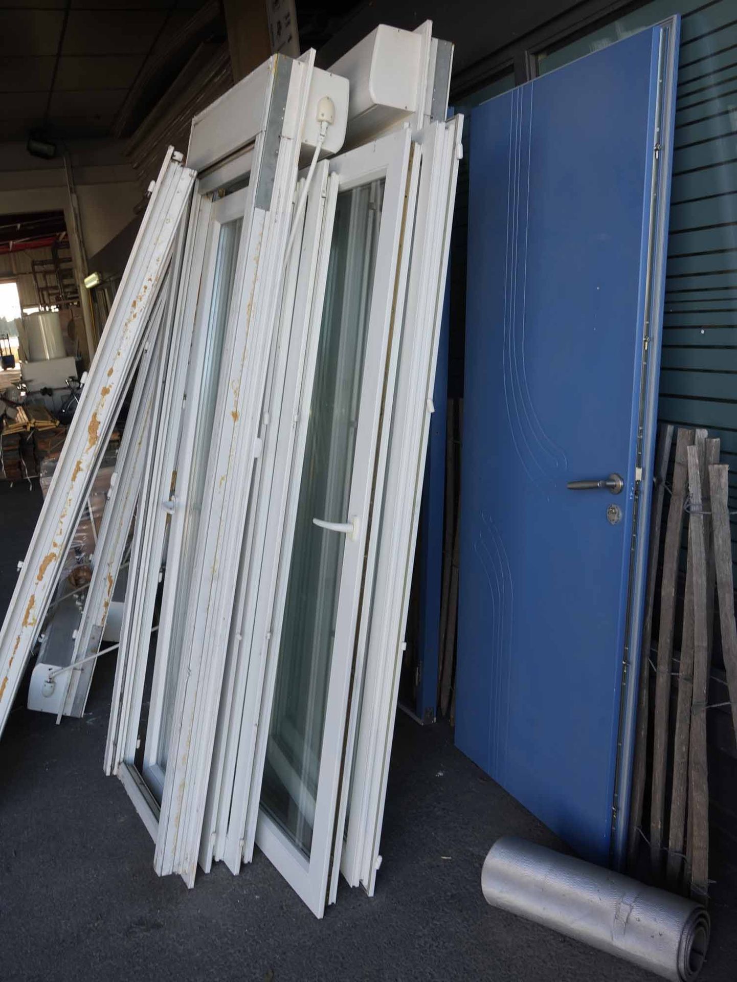 nombreuses menuiseries PVC, très grand lot de plots de terrasse (plusieurs dimensions), palettes de tuiles, plaques de mélaminé, isolants PU, plateaux avec vasques d’angle, grand lot de rouleaux de moquette (nombreuses couleurs), modules de cuisine, banque d’accueil, etc.