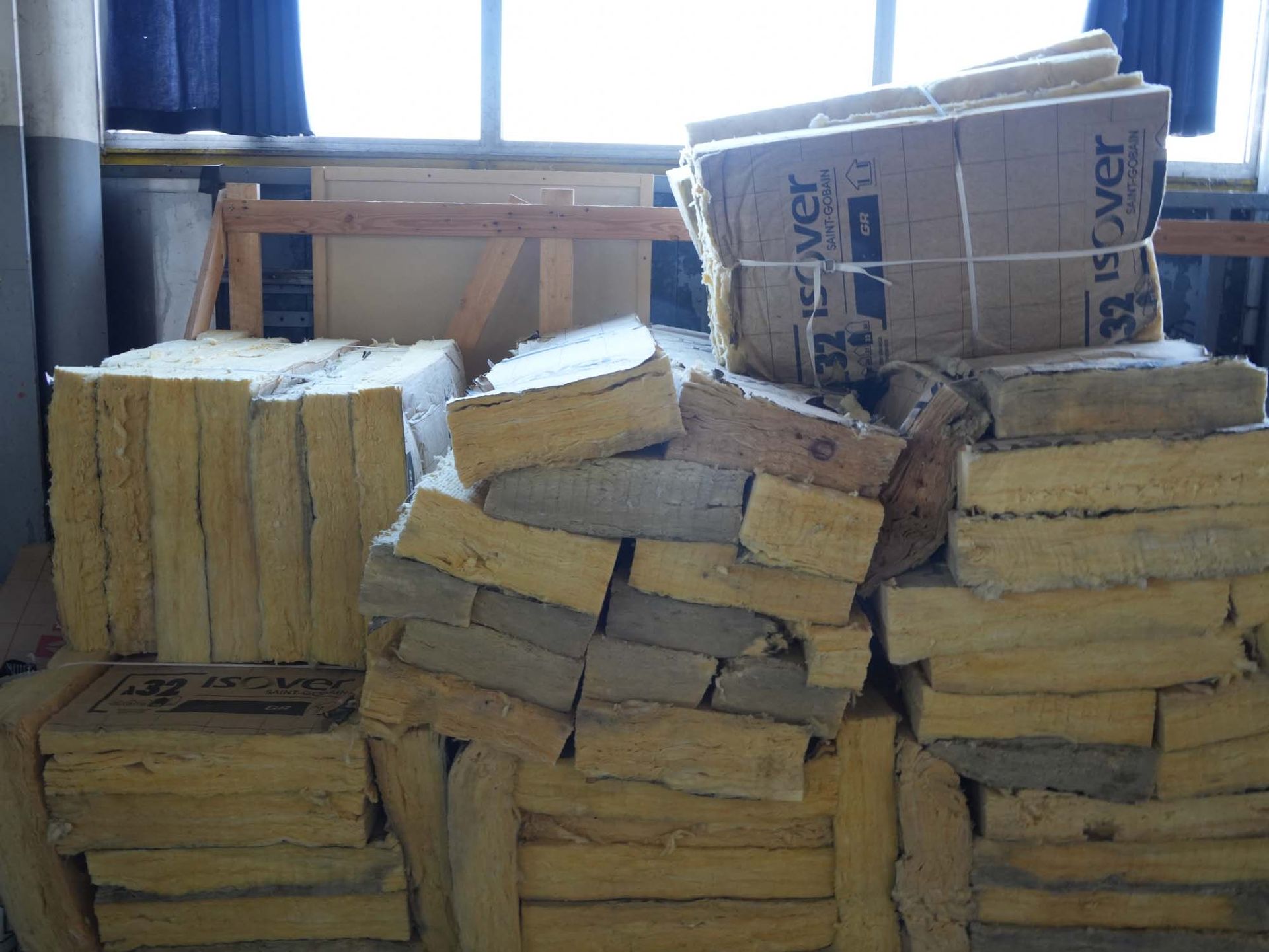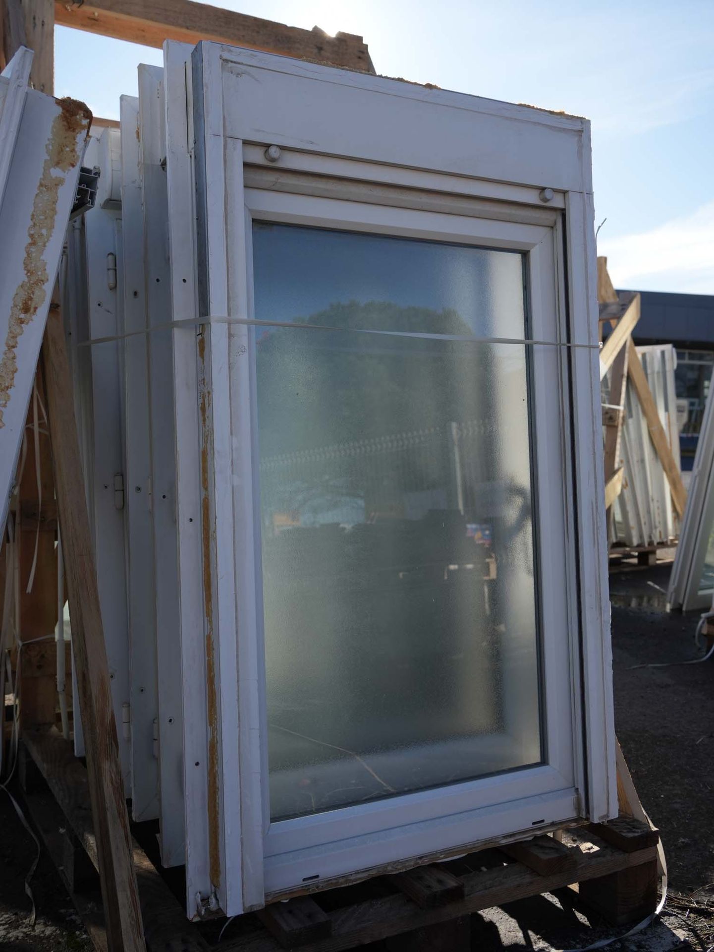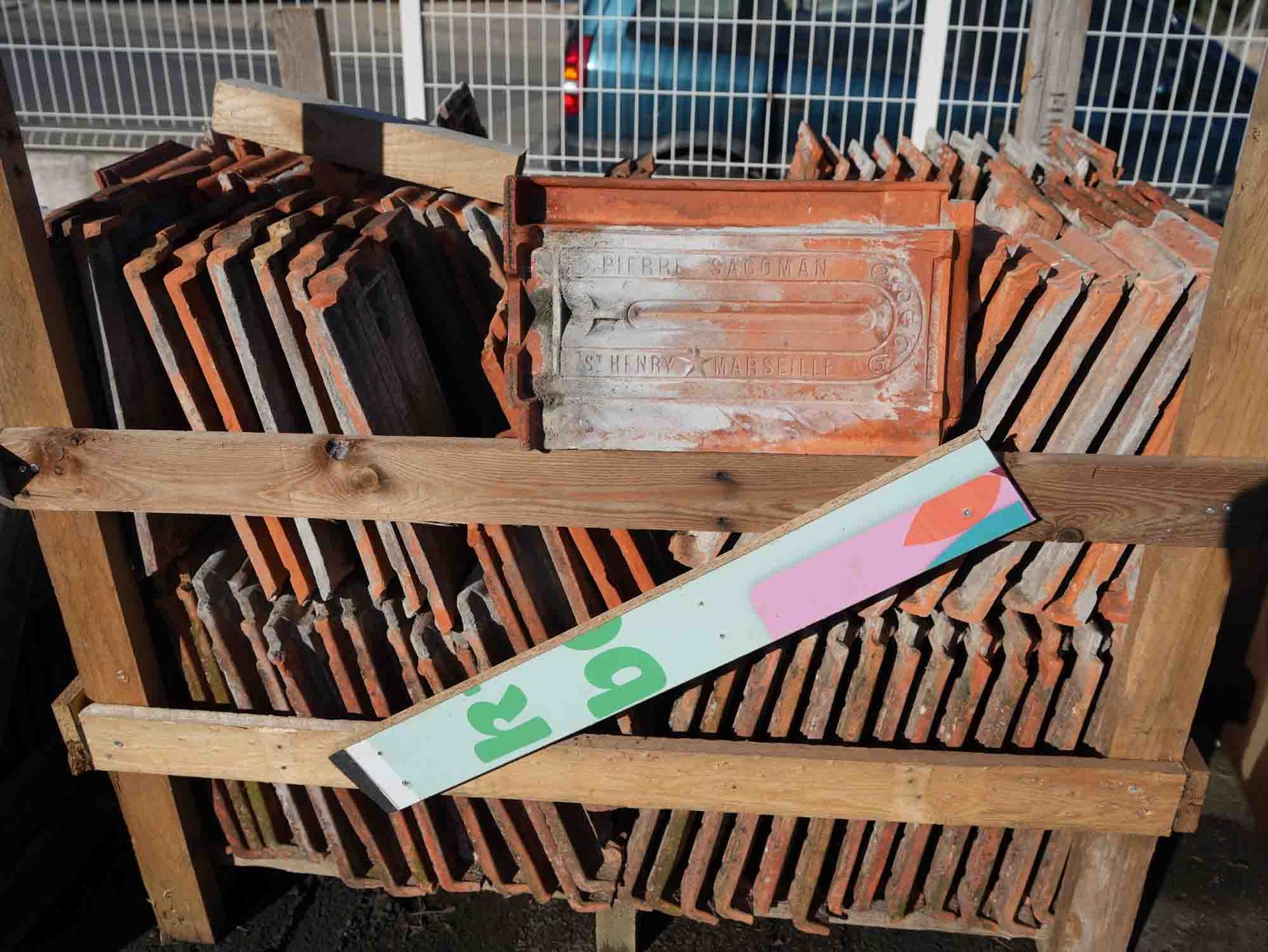nombreuses menuiseries PVC, très grand lot de plots de terrasse (plusieurs dimensions), palettes de tuiles, plaques de mélaminé, isolants PU, plateaux avec vasques d’angle, grand lot de rouleaux de moquette (nombreuses couleurs), modules de cuisine, banque d’accueil, etc.